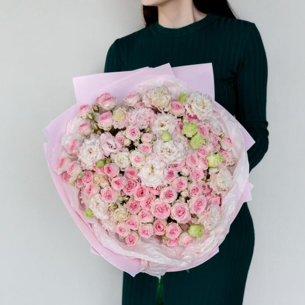Нежный букет с лизиантусом и кустовой розой в круглой упаковке.