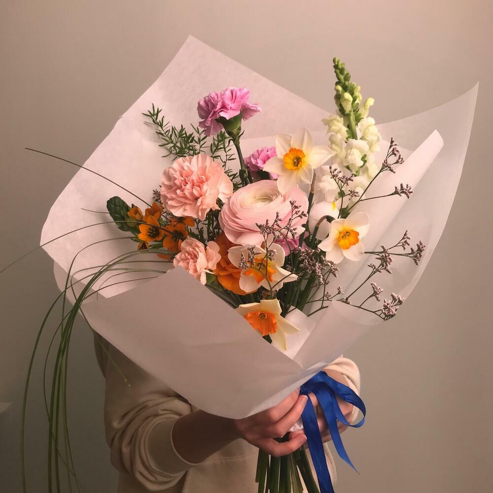 Ранункулюс - 1 шт.Ирис - 1 шт.Нарцисс - 4 шт.Гвоздика - 5 шт.Орнитогалум - 1 шт.антиринум - 1 шт.аспарангус - 1 шт.
